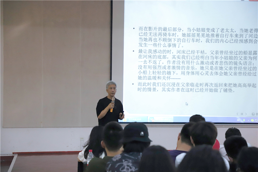 随后,黄教授通过《父与女》《那天下午》《海棠树下》三个短篇动画来阐释美的定义。《父与女》通过片中光影、透视贯穿全片,让大家感受到以压抑突显出的悲伤美。在学生作品《那天下午》《海棠树下》中,前者体现了轻松欢快的童年之美,后者体现了离别愧疚的童年悲伤。