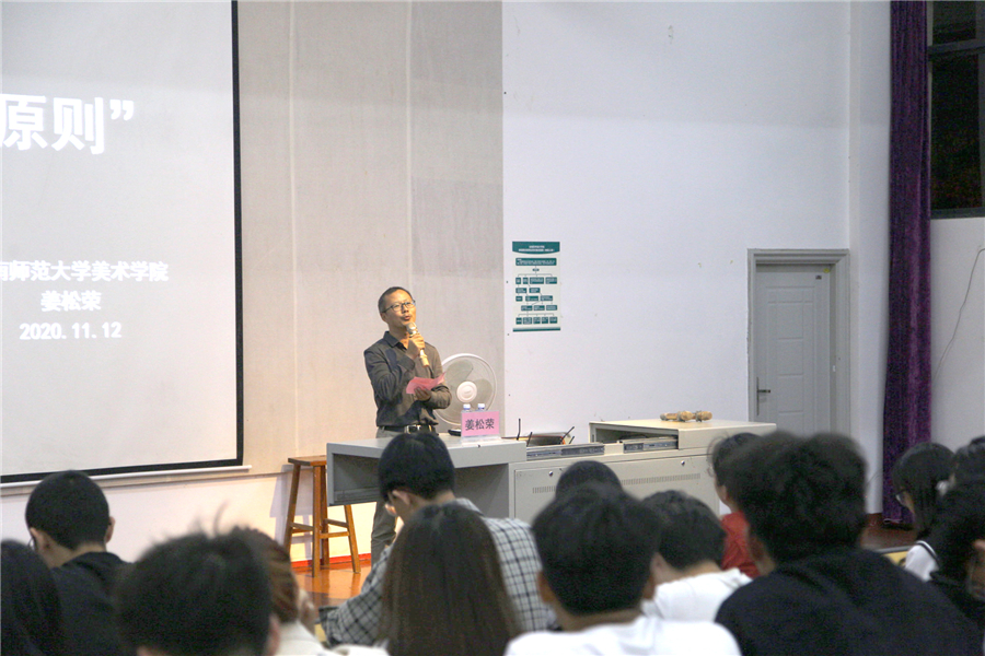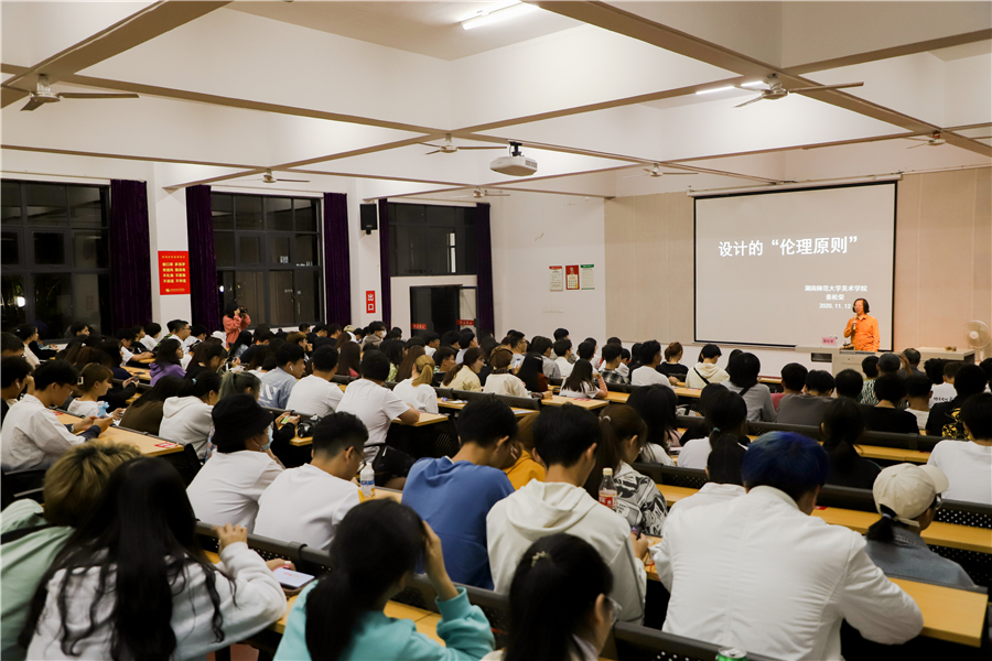 2020 年11 月12日晚于我校⻄区伦理楼107,湖南师范大学美术学院姜松荣教授为我校师生带来⼀场题为《设计的伦理原则》的精彩讲座,现场座无虚席,本次讲座由副校长王斌主持。