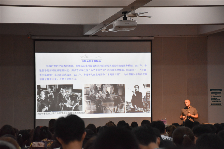 讲座过程中,张教授从中国早期油画、漫画、木刻版画三方面介绍了抗战前的中国美术发展情况。重点回顾了我国早期漫画的发展历程。当时由于日本向俄国学习,取得了政治上的成功,大量青年画家由学洋转为学日,而之后随着学习西方的风潮兴起,中国早期漫画应运而生。