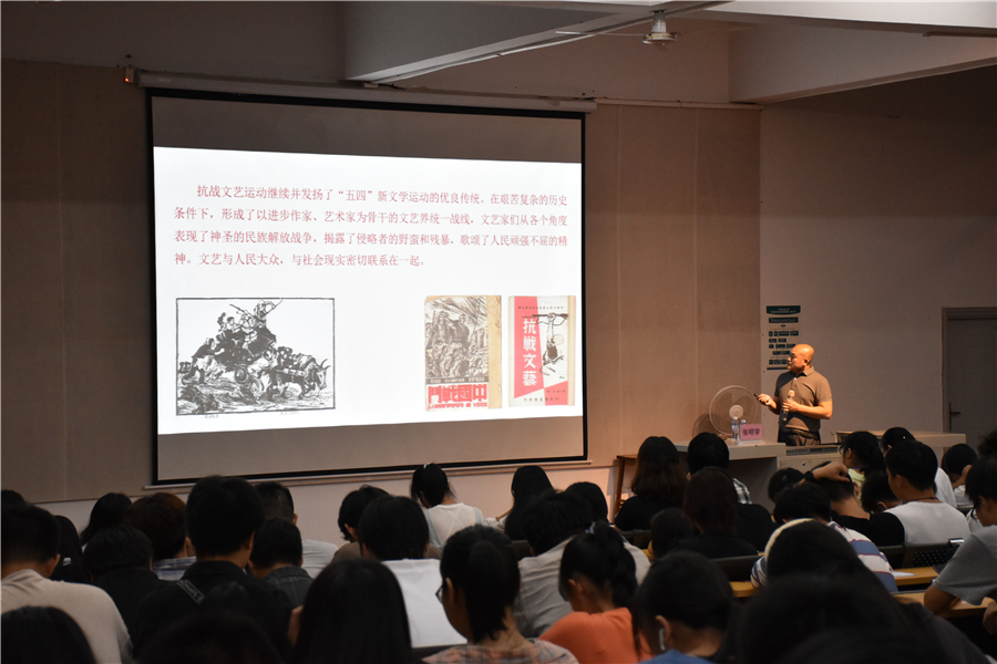 2020年11月18日晚7:30于我校西校区伦理楼107,广西大学艺术学院张明学教授为我校师生带来了一场题为《抗战时期美术作品人文与审美》的精彩讲座。本次讲座吸引众多师生到场聆听。讲座由我校教务处副处长武鹏程主持。