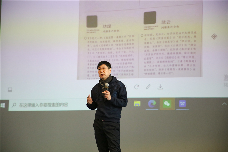 贾玺增教授通过品牌《龙的传人》为媒介,指出服装设计师的行为准则。服装设计讲求方法,在拥有明确的学术分析与判断之后,设计师的职业素质和解决问题的能力都会得到提升。大家在服装史的学习中,是要将服装史应用到设计里,做到知行合一,然后进行产品升级设计。另外,根据设计时的九个波段其作用的色彩样式不同,考虑不同的区间,区间与区间之间的搭配与衔接,体现出设计的和谐性与美感。