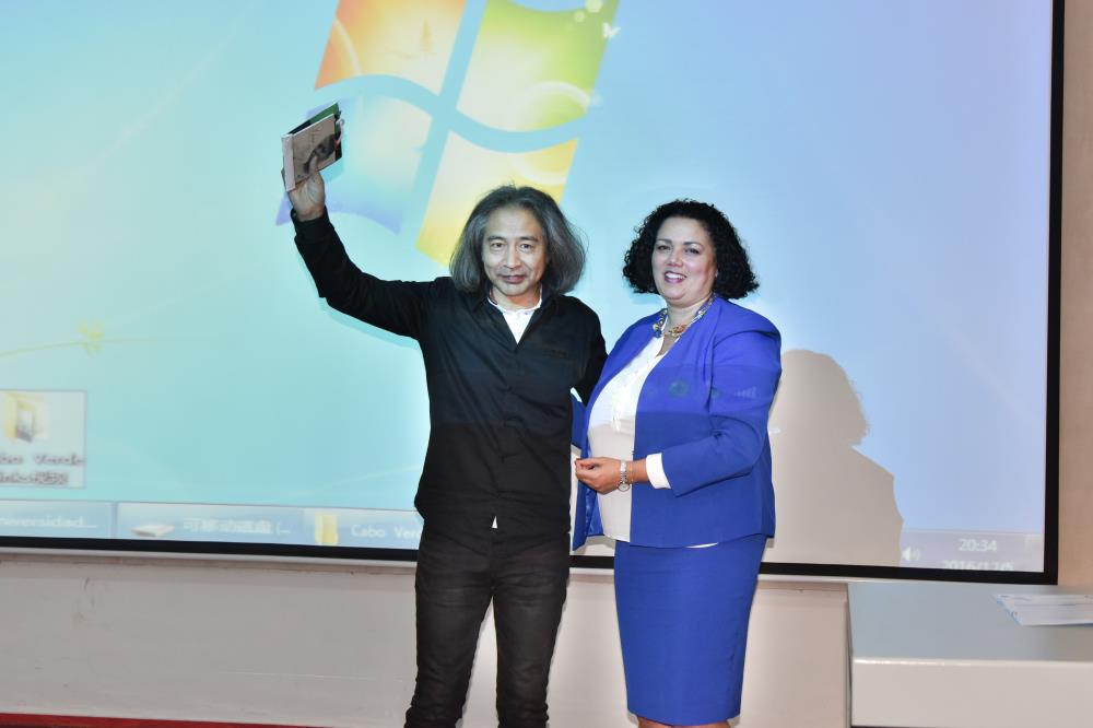 最后,大使向我院郑超副院长和刘北光教授赠送了一份代表佛得角国家文化的礼物,郑院长向大使表达了感谢,并向同学们再次强调大使所讲到的:人类之间不应存在歧视,要平等对待,用文化交流。