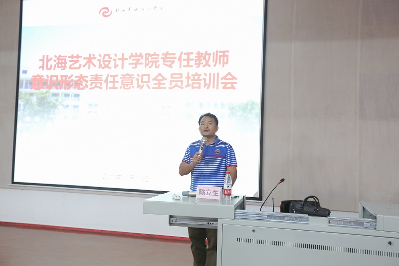 2017年10月13日下午,广西壮族自治区高校工委、教育厅主办的全区高校专任教师意识形态责任意识全员培训班在我院开讲。宣讲团成员、自治区党委党史研究室主任陈立生及钦州学院党委书记赵君教授分别为全院专任做讲座。讲座由我院党委副书记兼副院长林秀琪主持。