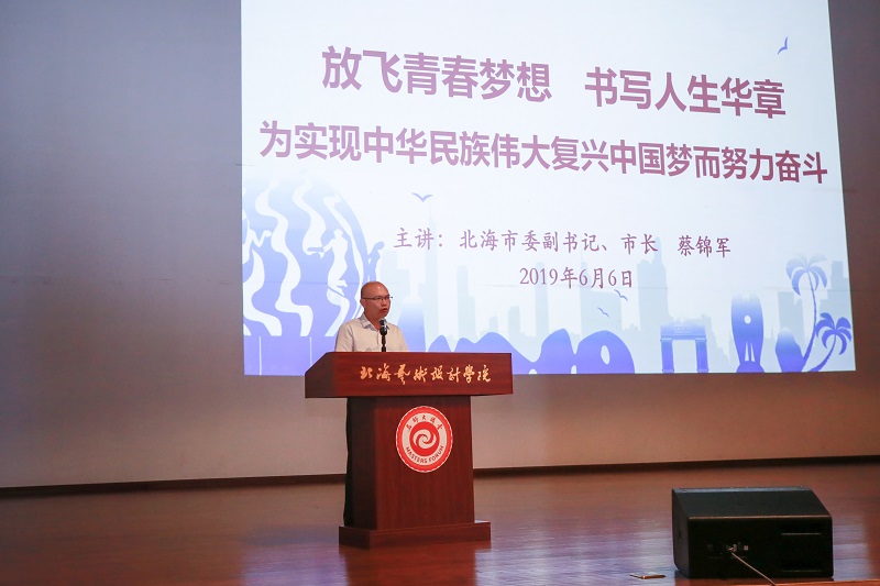 2019年6月6日下午,北海艺术设计学院大礼堂掌声不断, “2019年北海市领导干部上讲台开展思想政治教育活动”正在这里举行,北海市委副书记、市长蔡锦军作思想政治教育专题讲座。北海市教育局领导班子、市直中小学书记校长及我校师生代表750余人聆听了讲座。
